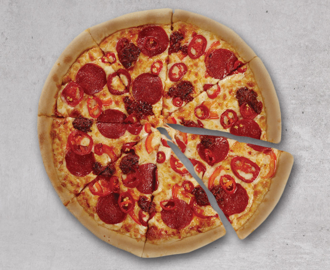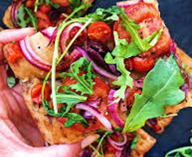 €13.00HUMMUS BASE, TOMATO SAUCE, FALAEL, SUNBLUSHED TOMATO, RED ONION, BLACK OLIVES, ROCKET, CHEESE & TOMATO